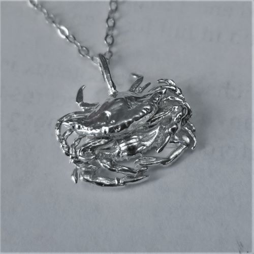 Chesapeake Doubler Crab Pendant, Sterling Silver 1″. So what is a “doubler” crab? A doubler crab is catching a mating pair of blue crabs together. The male surrounds the female beneath him while she moults or shed’s her crustaceous old coat for a new one. It means he care’s for his mate and is going to protect her… Say’s a alot don’t it…Many a lady around the bay has been presented one of these as a gift. They know what it represent’s.