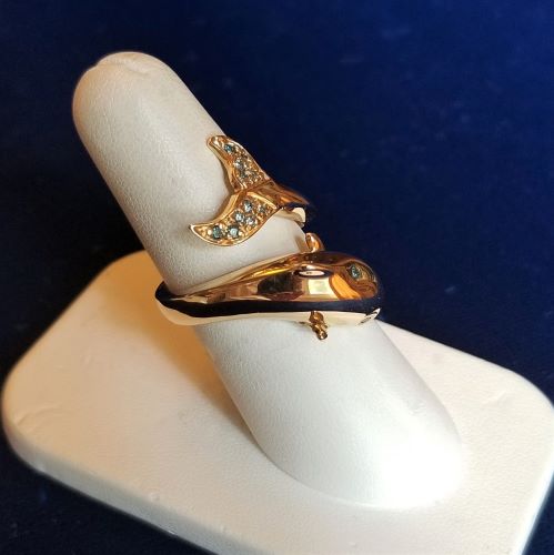 Solid 14k yellow Gold Dolphin ring literrally wraps comfortably around your finger and features pave’ set blue diamonds in the eye’s, blow hole and tail flukes. A beautiful, stylish, attention getter. Available in sizes 6-9.