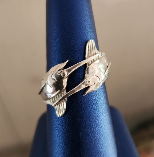 Our own Double Marlin head ring. Cast in solid high polish sterling silver.  With or without Sapphire eyes. Available in sizes 6-9.