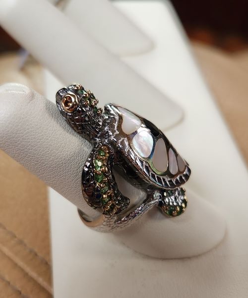 Swimming Sea Turtle Ring Mother Of Pearl inlay with Gemstones