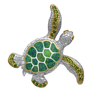 Swimming Sea Turtle Pendant XL with Green opal inlay and Gemstones on the flippers, and Eye’s with 18k Gold overlay accents. The Swimming Sea Turtle Pendant is cast in solid .925 Sterling silver with a hidden flipper bail that works easily with our Diamond cut rope style Chains. Please note: a 22″ Silver Rolo chain is included.